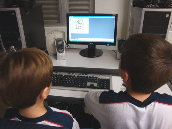 Nas aulas de informática da professora Paula, conteúdos que vão além dos procedimentos para uso do computador e seus programas são trabalhados, já que, em duplas, os alunos criam, dividem, se divertem, e aprendem procedimentos e atitudes.