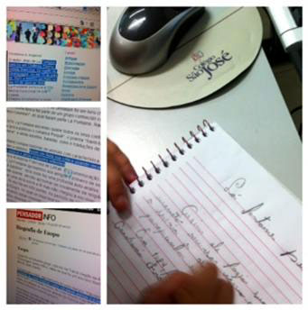 2º - Para pesquisar utilizaram site de busca e navegaram na web para retirar informações e registrar no formato de escrita e de imagens. Algumas duplas pesquisaram as curiosidades (informações) sobre ESOPO e outras duplas sobre LA FONTAINE e fizeram seus registros.
